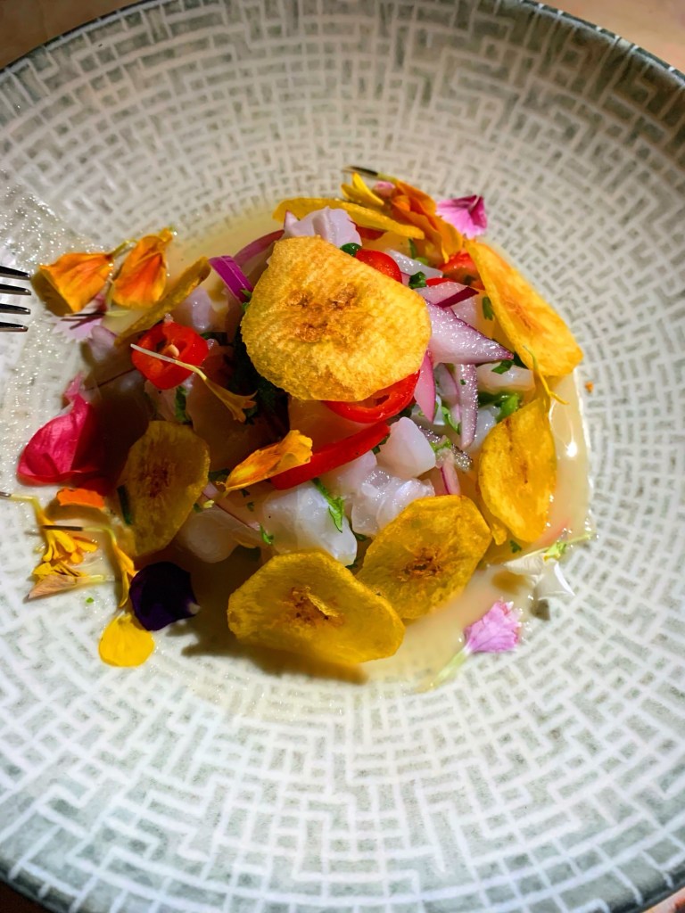 There was a time when I naively thought that raw fish was exclusive to the Japanese and sashimi was the only form of raw seafood I enjoyed – fast forward a number of years and now I’m a fan of any form of raw/cured seafood. Pink ling is an eel-like fish with a mild flavour, moist yet firm flesh and few bones – perfect for marinating in the leche de tigre (lime juice and salt). The citrusy taste of the ceviche complements the plantain fritos perfectly – the beautiful presentation with edible flowers was the cherry on top of this dish.